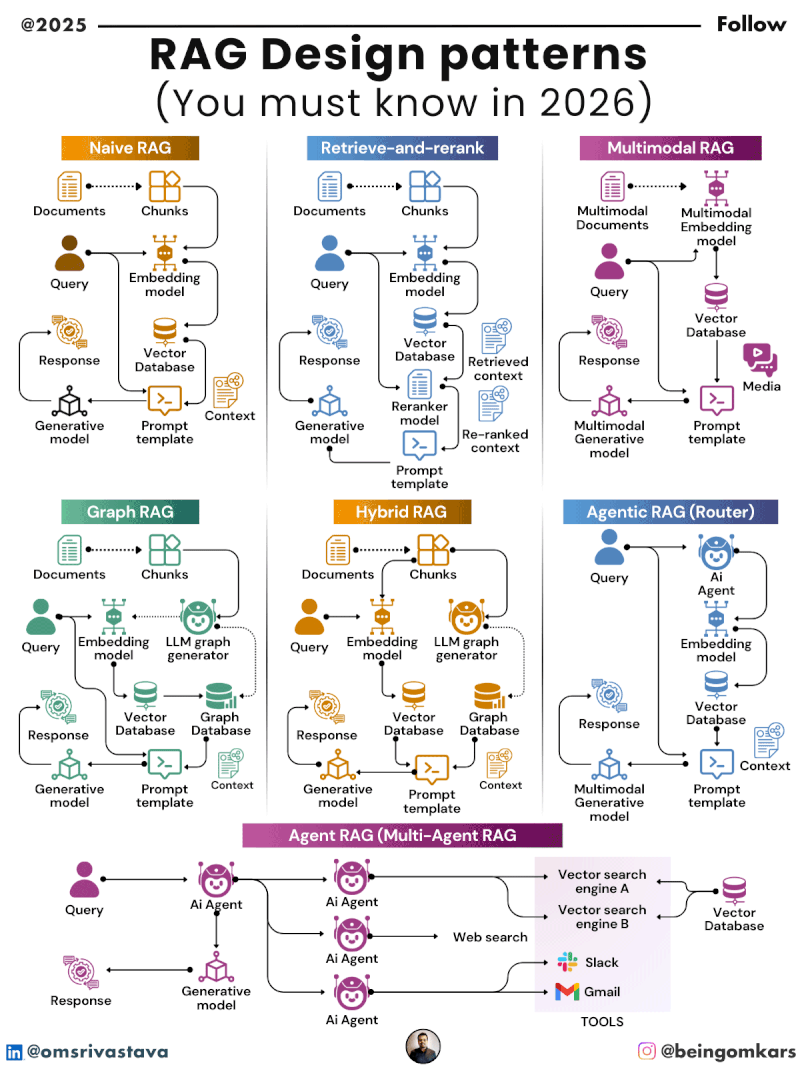 - Multiple design patterns exist, including Naive RAG, Advanced Retrieval with Re-ranking, Hybrid Retrieval, Iterative RAG, Self-RAG, and Modular RAG, each suited to different use cases.
