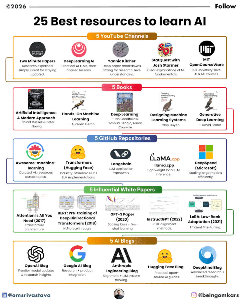 Here are 25 of the best AI learning resources, organized into five powerful categories.