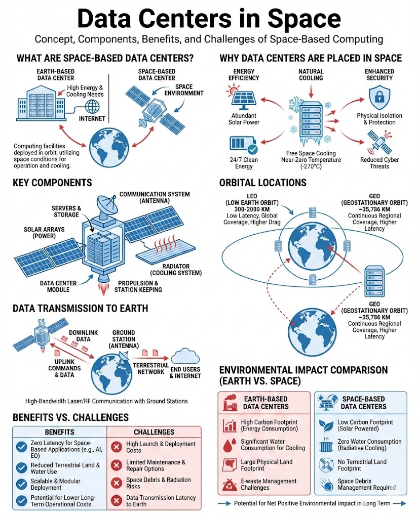 Traditional data centers are ground-based facilities that house servers, networking equipment, and storage systems. They consume significant amounts of electricity, both to power computing hardware and to cool it. As global data generation grows rapidly—driven by cloud computing, artificial intelligence, the Internet of Things (IoT), and satellite constellations—the scalability and sustainability of terrestrial data centers have become major concerns.