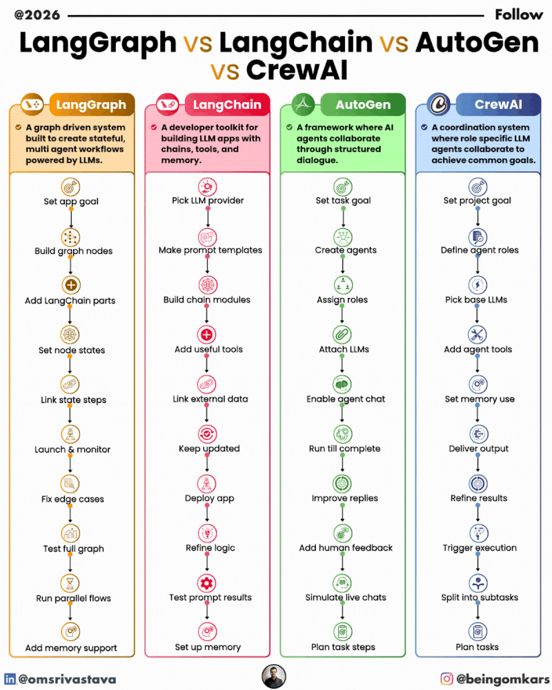 As artificial intelligence continues to evolve, developers and organizations are increasingly turning to specialized frameworks to build complex, multi-agent, and workflow-driven AI applications. Among the most prominent tools in this space are LangGraph, LangChain, AutoGen, and CrewAI. While these frameworks share some overlapping goals—such as enabling the use of large language models (LLMs) in structured applications—they differ significantly in architecture, design philosophy, and use cases. This article provides a clear, factual comparison of these four frameworks to help developers and decision-makers understand their core features and ideal applications.