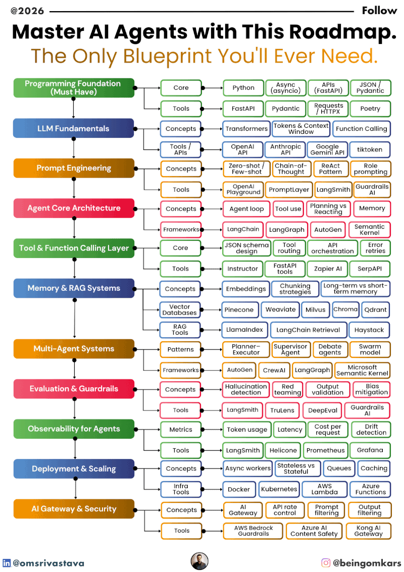 This roadmap isn’t about learning tools randomly—it’s about building AI agents like real software systems.