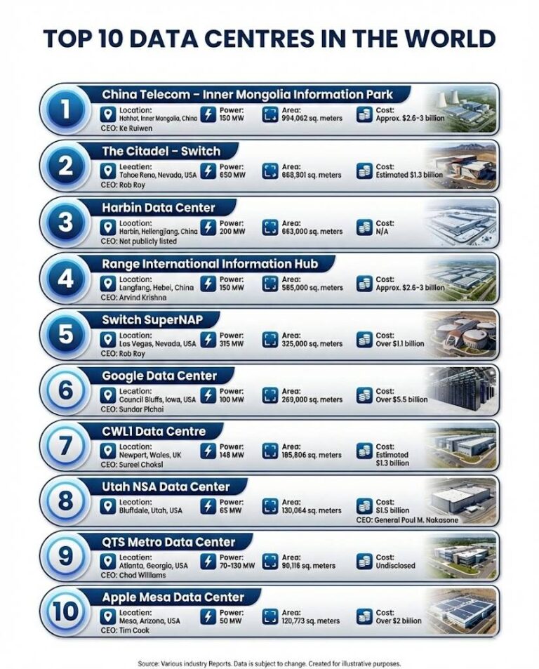 Rank Data Center Name Location Power Capacity (MW) Area (sq. meters) Cost (€/$) CEO 1 China Telecom – Inner Mongolia …
