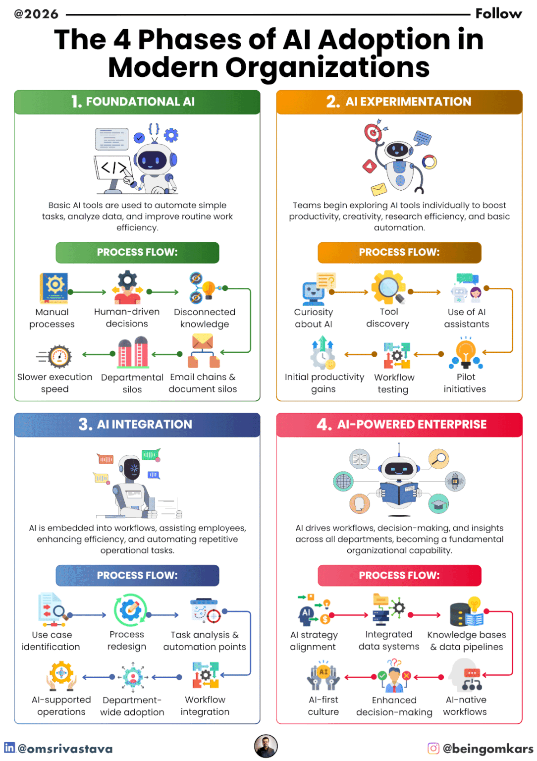 AI adoption is a journey, not a switch. Organizations typically evolve from: