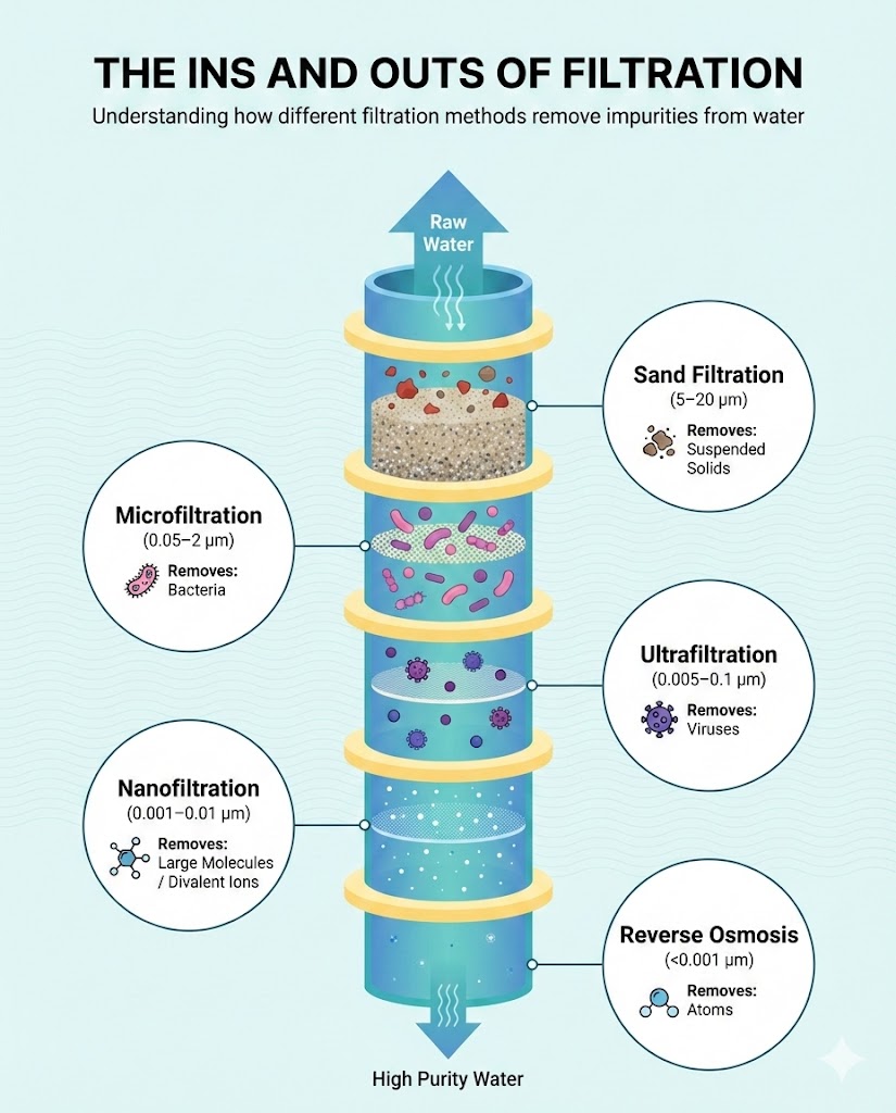 - Microfiltration: Removes particles larger than 0.1 microns, such as bacteria and sediment. Used in food and beverage processing.