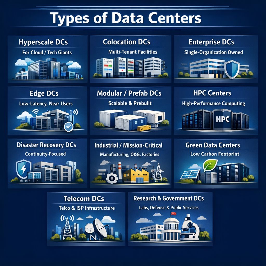 Data centers are designed based on scale, ownership model, workload type, latency needs, and resiliency requirements. Below are the major categories of DC projects used globally.