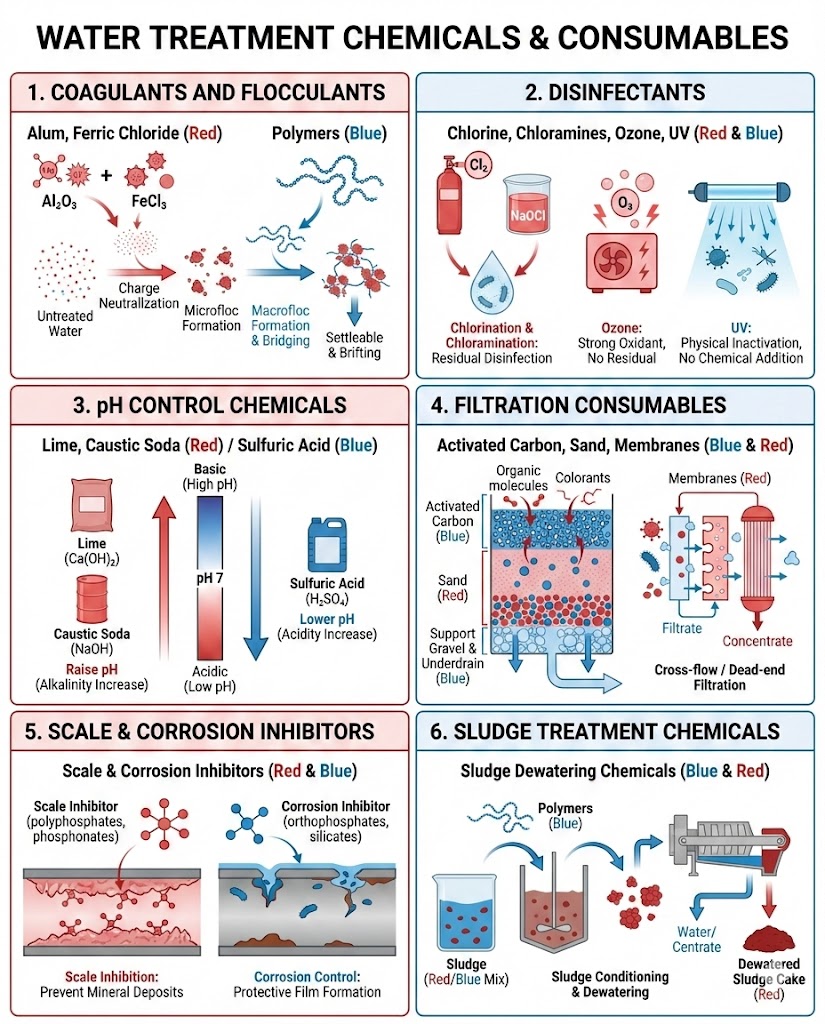 Water treatment chemicals and consumables are a broad group of chemical substances, reagents, and expendable materials used to improve water quality by removing physical, chemical, and biological contaminants. They are essential to the treatment of drinking water, wastewater, industrial process water, cooling and boiler water, desalinated water, and reclaimed or reused water. These chemicals and consumables support public health protection, industrial efficiency, environmental compliance, and sustainable water management.