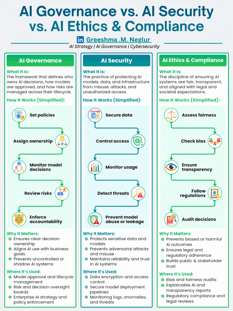 - These areas are interdependent: strong governance supports ethical and secure AI, while ethics and security inform governance decisions.