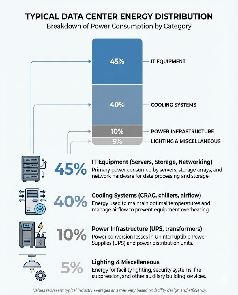 - Power distribution and backup systems contribute 10–15%, with losses occurring during conversion and transmission.